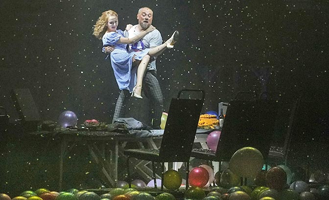 Хороша сцена побега инфантильного Подколесина из-под венца. С колосников на героя опускается свадебный стол, висевший над ним весь спектакль, как дамоклов меч. Почти распластав незадачливого жениха на земле, квадратный стол практически лишает героя путей к отступлению. Финал всем известен. Смешно и грустно. И только Балтазар Балтазарович, потерпевший полное фиаско на ниве сватовства, к финалу событий один из всех претендентов на руку, но не на сердце Агафьи Тихоновны, вызывает острое сочувствие. Одиночество и забвение маленького человека приподнимают второстепенного героя пьесы до обобщений личной драмы…
