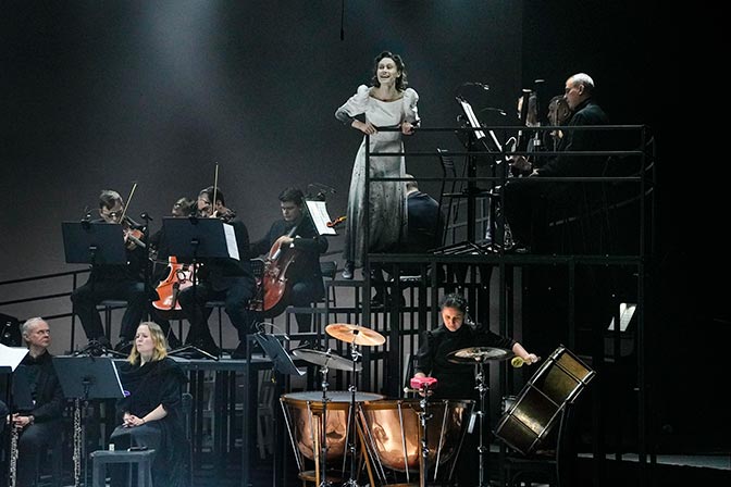 А потом наступила тишина. Её прервал звонкий голос Аделины Бухваловой. За спиной актрисы нежно звучит флейта-пикколо. Хрупкая как тростиночка героиня в белом платье стоит на самой высокой точке спиралеобразного подиума среди музыкантов. Он был смонтирован в глубине сцены на поворотном круге специально для оркестра на 17 человек во главе с дирижёром Владимиром Дороховым.