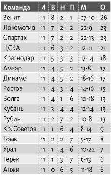 11-й тур: «Терек» – ЦСКА – 2:0, «Зенит» – «Спартак» – 4:2, «Динамо» – «Крылья Советов» – 2:0, «Волга» – «Кубань» – 1:0, «Краснодар» – «Рубин» – 1:0, «Анжи» – «Амкар» – 2:2, «Ростов» – «Урал» – 1:1.