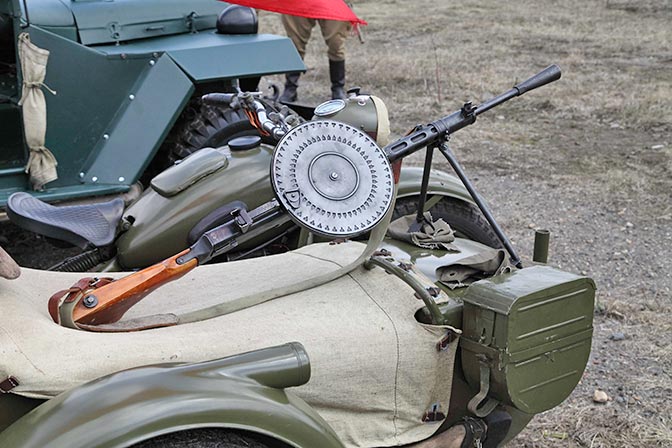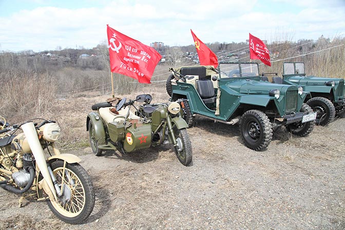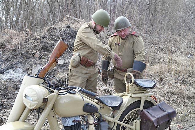 Эту кавалькаду из двух тёмно-зеленых ГАЗ-67 и двух мотоциклов времен Великой Отечественной мы заметили издалека. Как тут не заметить, если по пути ее следования до места фотосъемок головы сворачивали все прохожие, слегка обалдевшие от такого погружения в военное прошлое. Посмотреть было на что. Люди в форме во главе с офицером с серьезным видом, с оружием, на боевом транспорте выдвигаются в глухое место возле реки. Невольно на язык просится популярное ныне словцо «спецоперация».