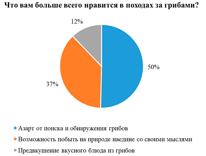 Зачем идти по грибы. На вопрос о мотивации для похода за грибами каждый второй (50%) ответил, что ценит его как возможность побыть наедине с природой и своими мыслями. Чуть более трети (37%) привлекают азарт поиска и обнаружения «добычи». Лишь 12% указали как основной мотиватор предвкушение вкусного блюда.