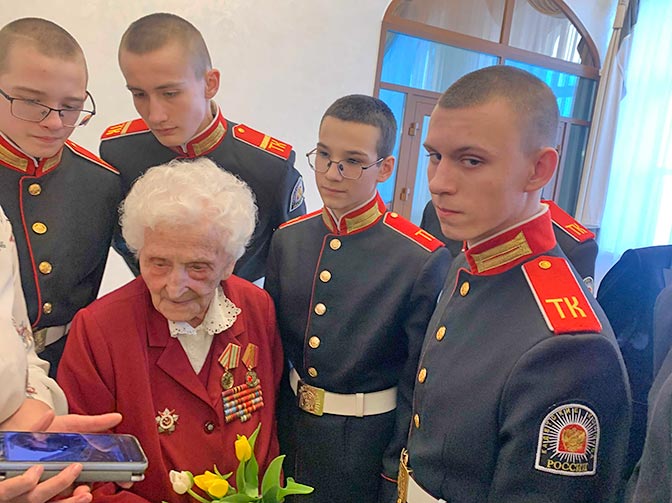 Кадеты, украсившие праздник своим вниманием к каждой приглашённой, своей выправкой и доброжелательностью, буквально ни на минуту не упускали из виду самых уважаемых гостей праздника – ветеранов Великой Отечественной войны – Надежду Александровну Зубову и Татьяну Фёдоровну Кронцеву. Я нечаянно подслушала разговор двух парней во время того, как Надежда Александровна вместе с кадетами смотрела на экране телефона ролик о бойцах СВО.