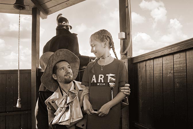 – Здравствуйте, я давно уже вас здесь поджидаю, – представляется экскурсовод Музея истории Томска Максим Адылшин в костюме волшебника Гудвина и приглашает Валерию вместе с ним ударить в колокол, загадывая про себя заветные желания. Девочка поначалу настолько опешила от такой неожиданной встречи, что интуитивно спряталась за папу, а потом осмелела и даже поинтересовалась у волшебника, знает ли он про Элли с Тотошкой, и, получив утвердительный ответ, немного успокоилась.