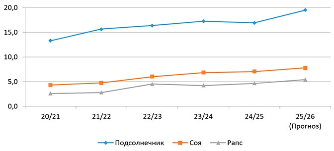 Валовый сбор подсолнечника, сои и рапса по аграрным сезонам, млн тонн
