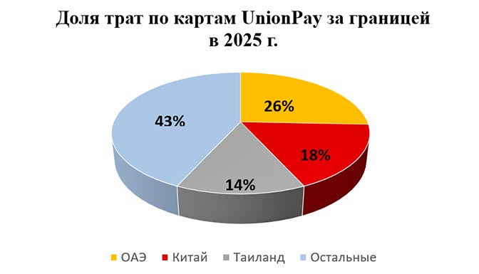 Аналитики Россельхозбанка выделили три страны-лидера по общему объему трат по картам UnionPay за 2025 году за рубежом. Первую строчку занимают Объединенные Арабские Эмираты, что составляет 26% от общего объема трат (43%), на втором месте — Китай (18%) и на третьем — Таиланд (14%). На эти три государства приходится более половины всех зарубежных расходов россиян.